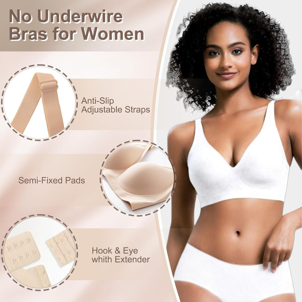 Answer 1: The wireless design of this bra eliminates discomfort caused by underwires, such as pinching or poking. It enhances your natural curves while allowing for better freedom of movement, making it perfect for all-day wear without sacrificing support or style.